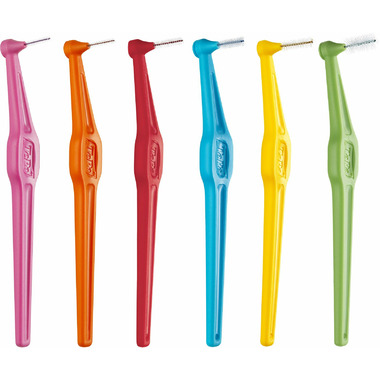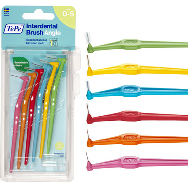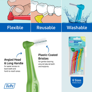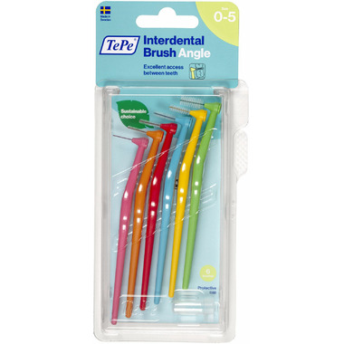 Designed to clean the gaps between the teeth, where a regular toothbrush is unable to reach. Can be used for cleaning between teeth, implants, crowns, and bridges. This interdental brush has a long handle and an angled head for easier access between the back teeth. By replacing fossil raw material with plant-based material in a mass balance system, TePe reduced the carbon footprint of this interdental brush by around 80% without compromising on product quality, efficiency, or design.