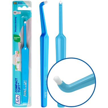 The TePe Compact Tuft Toothbrush is a precision-cleaning specialty brush designed to reach hard-to-access areas that standard toothbrushes cant easily reach. It features an angled handle and a small, dome-shaped brush head with densely packed, short filaments that provide firm control and targeted cleaning.