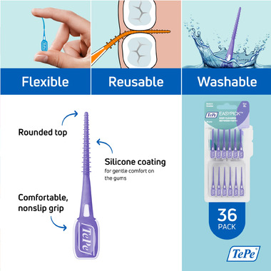 TePe EasyPickΙ is a soft pick for an easy and efficient way to clean between teeth, leaving the mouth fresh and healthy. The non-slip grip ensures a steady cleaning, also while wearing braces, implants, or crowns.