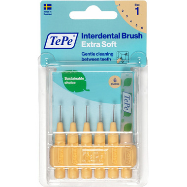 Designed to clean the gaps between the teeth, where a regular toothbrush is unable to reach. Can be used for cleaning between teeth, implants, crowns, and bridges. The product has extra soft filaments, suitable for patients with sensitive gums and teeth, dry mouth, or oral lesions. It can also be recommended post-surgery or for anyone preferring a softer brush. It is always the dental professional who decides when it is suitable to start mechanical cleaning after oral surgery. TePe Interdental Brush Extra Soft comes in 6 colour-coded sizes to fit narrow as well as wide gaps - ISO sizes 1-6. By replacing fossil raw material with plant-based material in a mass balance system, TePe reduced the carbon footprint of this interdental brush by around 80% without compromising on product quality, efficiency, or design.