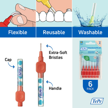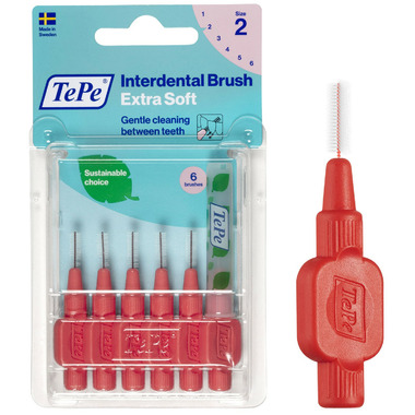 Designed to clean the gaps between the teeth, where a regular toothbrush is unable to reach. Can be used for cleaning between teeth, implants, crowns, and bridges. The product has extra soft filaments, suitable for patients with sensitive gums and teeth, dry mouth, or oral lesions. It can also be recommended post-surgery or for anyone preferring a softer brush. It is always the dental professional who decides when it is suitable to start mechanical cleaning after oral surgery. TePe Interdental Brush Extra Soft comes in 6 colour-coded sizes to fit narrow as well as wide gaps - ISO sizes 1-6. By replacing fossil raw material with plant-based material in a mass balance system, TePe reduced the carbon footprint of this interdental brush by around 80% without compromising on product quality, efficiency, or design.