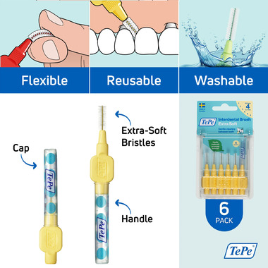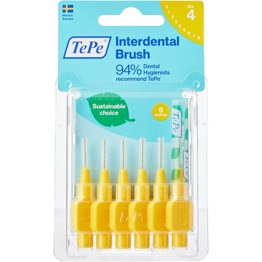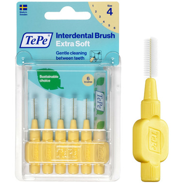 Designed to clean the gaps between the teeth, where a regular toothbrush is unable to reach. Can be used for cleaning between teeth, implants, crowns, and bridges. The product has extra soft filaments, suitable for patients with sensitive gums and teeth, dry mouth, or oral lesions. It can also be recommended post-surgery or for anyone preferring a softer brush. It is always the dental professional who decides when it is suitable to start mechanical cleaning after oral surgery. TePe Interdental Brush Extra Soft comes in 6 colour-coded sizes to fit narrow as well as wide gaps - ISO sizes 1-6. By replacing fossil raw material with plant-based material in a mass balance system, TePe reduced the carbon footprint of this interdental brush by around 80% without compromising on product quality, efficiency, or design.