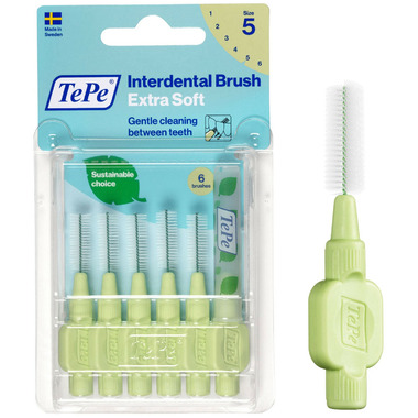Designed to clean the gaps between the teeth, where a regular toothbrush is unable to reach. Can be used for cleaning between teeth, implants, crowns, and bridges. The product has extra soft filaments, suitable for patients with sensitive gums and teeth, dry mouth, or oral lesions. It can also be recommended post-surgery or for anyone preferring a softer brush. It is always the dental professional who decides when it is suitable to start mechanical cleaning after oral surgery. TePe Interdental Brush Extra Soft comes in 6 colour-coded sizes to fit narrow as well as wide gaps - ISO sizes 1-6. By replacing fossil raw material with plant-based material in a mass balance system, TePe reduced the carbon footprint of this interdental brush by around 80% without compromising on product quality, efficiency, or design.