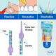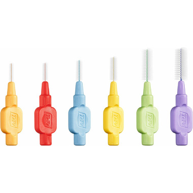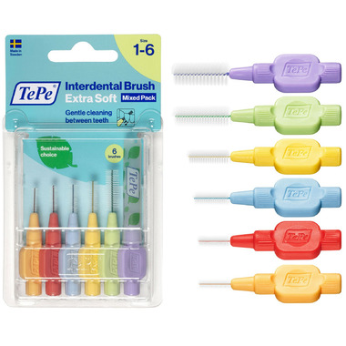 Designed to clean the gaps between the teeth, where a regular toothbrush is unable to reach. Can be used for cleaning between teeth, implants, crowns, and bridges. The product has extra soft filaments, suitable for patients with sensitive gums and teeth, dry mouth, or oral lesions. It can also be recommended post-surgery or for anyone preferring a softer brush. It is always the dental professional who decides when it is suitable to start mechanical cleaning after oral surgery. TePe Interdental Brush Extra Soft comes in 6 colour-coded sizes to fit narrow as well as wide gaps - ISO sizes 1-6. By replacing fossil raw material with plant-based material in a mass balance system, TePe reduced the carbon footprint of this interdental brush by around 80% without compromising on product quality, efficiency, or design.