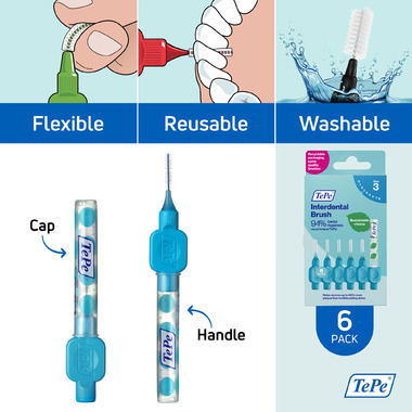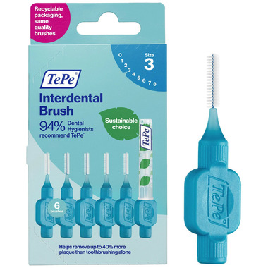 Designed to clean the gaps between the teeth, where a regular toothbrush is unable to reach. Can be used for cleaning between teeth, implants, crowns, and bridges. TePe Interdental Brush Original comes in 9 colour-coded sizes to fit narrow as well as wide gaps - ISO sizes 0-8. Daily use can help remove up to 40% more plaque than toothbrushing alone. Effective plaque removal prevents gum inflammation, cavities, and bad breath. By replacing fossil raw material with plant-based material in a mass balance system, TePe reduced the carbon footprint of this interdental brush by around 80% without compromising on product quality, efficiency, or design.
