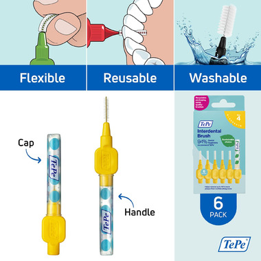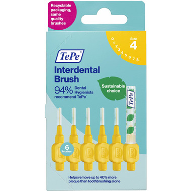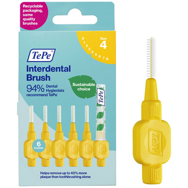 Designed to clean the gaps between the teeth, where a regular toothbrush is unable to reach. Can be used for cleaning between teeth, implants, crowns, and bridges. TePe Interdental Brush Original comes in 9 colour-coded sizes to fit narrow as well as wide gaps - ISO sizes 0-8. Daily use can help remove up to 40% more plaque than toothbrushing alone. Effective plaque removal prevents gum inflammation, cavities, and bad breath. By replacing fossil raw material with plant-based material in a mass balance system, TePe reduced the carbon footprint of this interdental brush by around 80% without compromising on product quality, efficiency, or design.