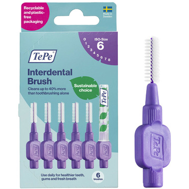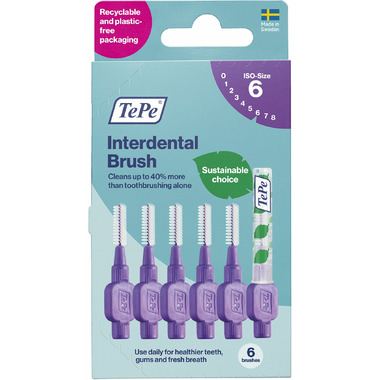 Designed to clean the gaps between the teeth, where a regular toothbrush is unable to reach. Can be used for cleaning between teeth, implants, crowns, and bridges. TePe Interdental Brush Original comes in 9 colour-coded sizes to fit narrow as well as wide gaps - ISO sizes 0-8. Daily use can help remove up to 40% more plaque than toothbrushing alone. Effective plaque removal prevents gum inflammation, cavities, and bad breath. By replacing fossil raw material with plant-based material in a mass balance system, TePe reduced the carbon footprint of this interdental brush by around 80% without compromising on product quality, efficiency, or design.