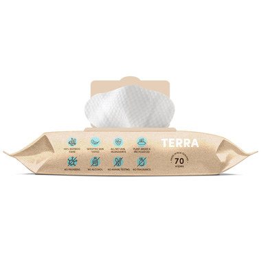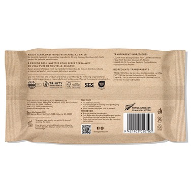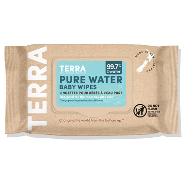 Terra Pure New Zealand Water Wipes are made with 100% Biodegradable bamboo fibre and 99.7% Pure New Zealand Water. Absolutely no harmful chemicals or unwanted ingredients.