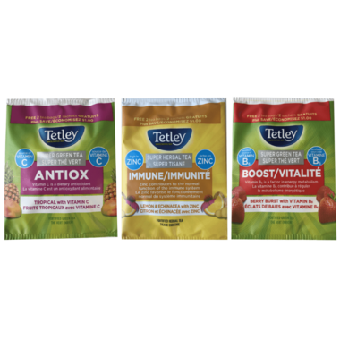 New Tetley Super Teas are Canada’s first line of teas fortified with vitamins & minerals, crafted to complement an active, balanced lifestyle. Each tea perfectly blends the flavours you've come to love from Tetley with health benefits to help you conquer the day!