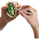 Each egg contains one plastic dinosaur model. The eggs are blind-packed, so it’s a surprise which of the 12 dinosaur figures you will get. A small chisel tool for digging the dino out of the egg and an instruction manual are included.
