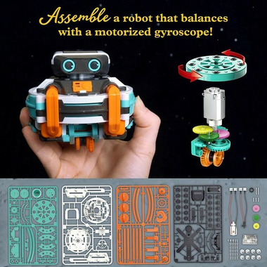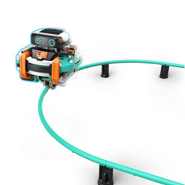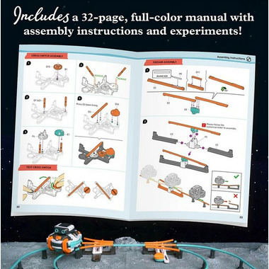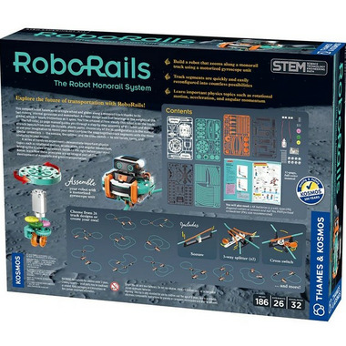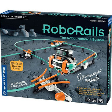Explore the future of transportation with RoboRails! This compact robot balances on a single wheel and glides along a monorail track thanks to its fast-moving internal gyroscope and monowheel. A clever design uses ball bearings as the weights of the gimbal, which is nearly frictionless as it spins. You'll be amazed at how steady this robot is on the track! The full-colour, 32-page manual guides you through a step-by-step assembly of the robot and dozens of track layouts from over 180 durable, plastic parts. Choose any of the 26 configurations in the manual or use your imagination to invent your own! Combine the snap-together track segments with the three special connectors - the seesaw, the splitter, and the cross switch to add twists, turns, and obstacles to your routes. A series of hands-on experiments demonstrate important physics topics such as rotational motion, acceleration, and angular momentum, bringing the science of gyroscopic forces to life right before your eyes! Bonus: learn how these principles are an integral part of the development of monorails and green transportation.