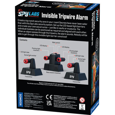 Create a top-of-the-line, 360-degree security zone in your room! Secrets have never been safer than with this Spy Labs security system. Activate the LED beams in the two transmitters with a push of a button, then align the light beams with the receivers on the base station to create an invisible tripwire. When the barrier is breached or interrupted, the alarm sounds and the interloper is revealed! The transmitters can be placed up to six feet apart and feature a small, discreet design ideal for covert spy play. The included instruction manual walks you through the quick and easy setup process and offers tips and tricks on how to set a successful trap.