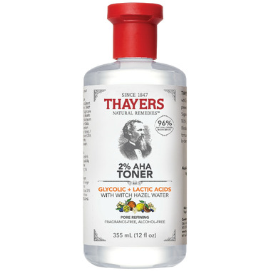 Thayers 2% AHA Toner is formulated with Glycolic and Lactic Acids that are present in their Orange, Lemon, Bilberry, Sugarcane, Sugar Maple extracts this unique, proprietary blend also contains certified organic, non-distilled Witch Hazel that's grown exclusively for Thayers on a family farm in Fairfield County, Connecticut.