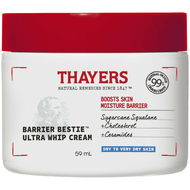 Thayers Barrier Bestie Moisturizer Ultra Whip Cream is a clinically tested face cream for dry to very dry skin. This moisturizing face cream works to strengthen and repair the skin's moisture barrier after just 1 use. This fragrance-free and cruelty-free moisturizer has been formulated with sugarcane squalane and ceramides. These extremely hydrating derm actives work together to instantly smooth dry patches for a softer and more comfortable complexion.