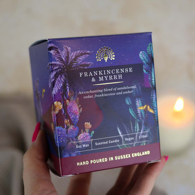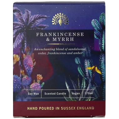 This Frankincense and Myrrh Scented Candle has an enchanting woody aroma. With warm notes of sandalwood, cedarwood and cinnamon, leading onto a base of frankincense, labdanum and amber.