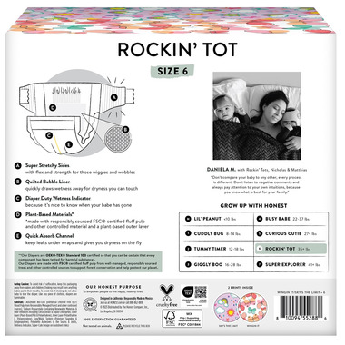 To make the core of the diaper, they harvest wood from sustainably-managed pine and spruce trees in Scandinavia, which is then turned into fluff pulp at a Swedish mill using chlorine-free processing. All diapers feature a Quilted Bubble Liner that quickly draws wetness away, a Wetness Indicator and Quick Absorb Channels that keep leaks under wraps.