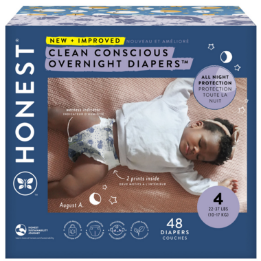 Honest Clean Conscious Overnight Diapers provide up to 12 hours of protection. Have overnight advanced wetness protection as well as extra absorbency, for those longer hours to help both you & baby sleep tight.