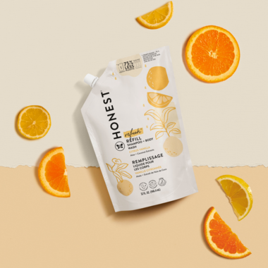Feel zen with The Honest Company's tear-free shampoo + body wash—now available in a 32-oz. refill! Fill up your empty bottles of Honest Shampoo + Body Wash with these convenient refill pouches and get more value (and less waste*) out of the product you love. Available in their fan-favourite Citrus Vanilla scent and created with a blend of naturally derived botanicals and essential oils that leave you and your babe’s scalp + skin feeling moisturized and clean. Gentle on your fam’s skin and a little more gentle on the planet.