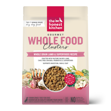 Too good to be called kibble, you can see and smell the real food ingredients in every golden, roasted bite of The Honest Kitchen's Whole Food Clusters. Crafted to support a variety of health benefits, this recipe is made with pasture raised lamb and antioxidant-rich whole foods like carrots and kale. Even the pickiest pups will love this dry food. Serve as their main meal, pair with a healthy topper or use as tasty training treats.