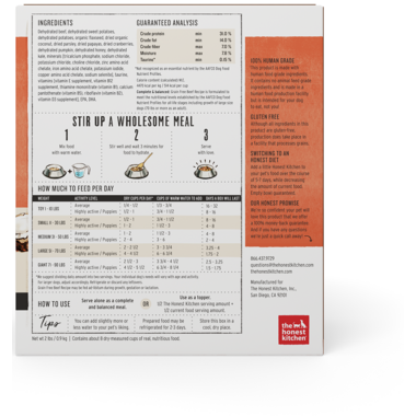 Directions: This dehydrated dog food will expand after you add water to it so a 2 lb box equals 8 lbs of fresh food. To serve, simply add warm water, wait 3 minutes, and serve for a fresh, wholesome and delicious meal!