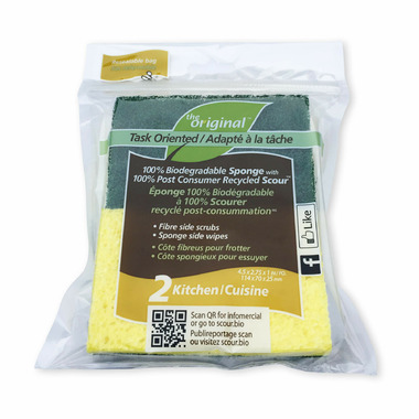 The Original Biodegradable Kitchen Sponge With Scourer is the most efficient, effective, environmentally responsible sponge you will ever use. It serves a dual purpose: the sponge side wipes and the fiber side scours. The sponge portion is 100% biodegradable and the scour portion is made of 100% post-consumer recycled soft-drink and water bottles.