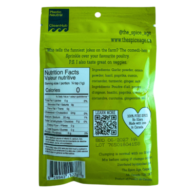 Garlic Powder, Onion Powder, Basil, Paprika, Cumin, Coriander, Turmeric, Ginger, Salt, Pepper.