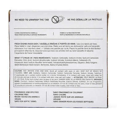 Tough on grease, the tabs are biodegradable and safe for septic tanks. No need to unwrap the water-soluble pouch when putting it into the dishwasher. The water-soluble pouches are made of Polyvinyl alcohol, a water-soluble polymer. Its purpose is to ensure integrity throughout the supply chain. 100% recyclable packaging. Non-toxic ingredients, free from fragrances and dyes. Keep out of reach of children.