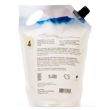 • Stand-up pouch fits easily on a shelf. Easy to manipulate and refill with the practical spout