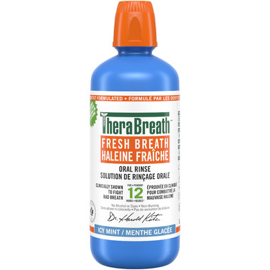TheraBreath Fresh Breath Oral Rinses are clinically shown to fight bad breath for 12 hours. TheraBeath is Dentist Formulated and the rinses contain no alcohol or dyes and are non-burning. Enjoy the cooling sensation of Icy Mint.
