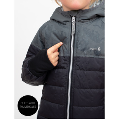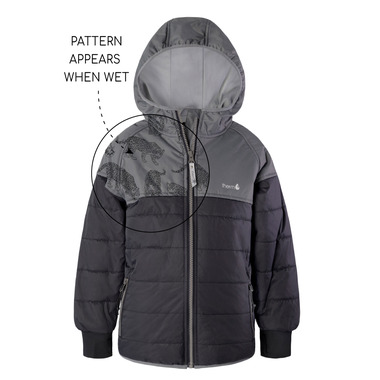 Therm Hydracloud features a full waterproof (hydra) and windproof outer combined with ultra-soft cloud-like comfort. Providing midweight warmth and protection in wind, rain and snow, and lined with soft-touch jersey mesh for a cozy feel inside. And when the puffer gets wet, a secret pattern is revealed! See the SplashMagic pattern appear in the rain then disappear again when dry. Fun for toddler and big kids alike!