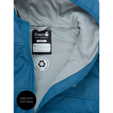 Materials: Outer: 3,500mm Waterproof 100% Recycled rPET shell with 5,000mm Waterproof Hood & Yoke. Lining: 100% Recycled rPET Soft Polyester Mesh Insulation: 120gsm (size 18m-6) / 180gsm (Size 6-14) EcoSoft Recycled Fill Made from sustainable recycled materials with recycled ocean plastic packaging.