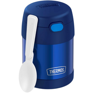 The FUNtainer Food Jar from Thermos brand is vacuum insulated to keep hot foods hot and cold foods cold-and since it's designed for kids it's also colourful and fun. Send them to school with their favourite soup so they can enjoy it fresh and hot at lunch time. If they're in the mood for a cold snack, pack it up with yogurt and berries, or apples and peanut butter. The FUNtainer food jar is light weight and compact with a push button lid so it's easy to carry and open. To clean, you can pop your FUNtainer food jar in the dishwasher; however washing by hand is recommended. Spoon included.