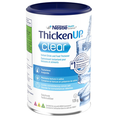 ThickenUp® Clear is a xanthan-based powdered thickener that remains clear, lump-free, tasteless, odourless, and maintains consistency over time once the desired thickness is reached. ThickenUp® Clear is clinically demonstrated to improve swallowing safety(1). ThickenUp® Clear is the #1 recommended brand of thickener for patients with dysphagia by Canadian dietitians(2).