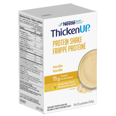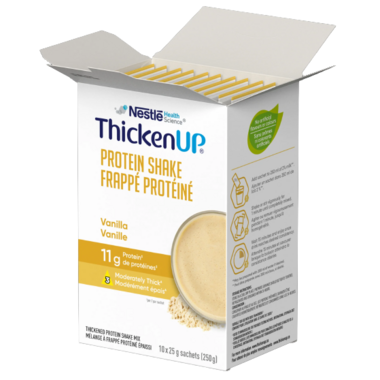 ThickenUp Protein Shake(10 x 25 g) is a thickened protein shake mix for individuals who require a texture modified diet with increased protein. Each sachet contains 11 g of whey protein isolate, 4 g of sugar and no artificial flavour, colour or sweetener. It is designed with Xanthan gum and achieves IDDSI* level 3 consistency when mixed with 250 ml of 2% milk or 200 ml of water. Each carton contains 10 individually portioned sachets. This product is suitable for individuals 14 years or older. For oral consumption only. Not suitable as a sole source of nutrition. To be used as directed by a healthcare professional. (*International Dysphagia Diet Standardization Initiative. www.iddsi.org)