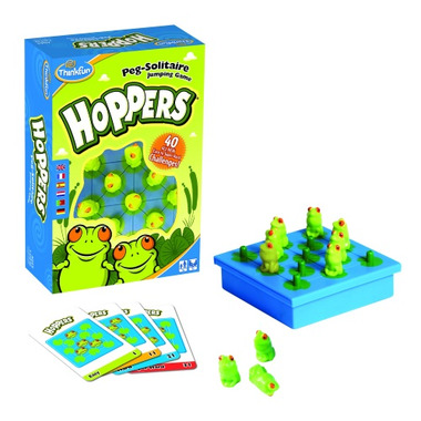 Hoppers is a peg solitaire jumping game – set the frogs on the pond, then jump frogs until only one is left standing. Forty challenge cards range from easy to super hard. Start simple and grow your skills with each level. In no time at all, you’ll be the smartest frog in the pond!
