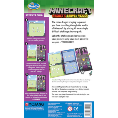 The ender dragon is trying to prevent you from travelling through the worlds of Minecraft by placing 40 increasingly difficult challenges in your path. Solve the challenges and advance on your journey, using your most powerful weapon your brain! In this mind-bending game of deductive reasoning, players use positive and negative visual clues to place magnetic Minecraft weapons and armor on the Crafting Table in the correct arrangement. When your arrangement includes all the Clue Patterns on the Challengeז YOU WIN!