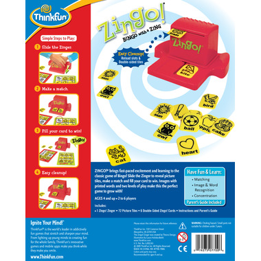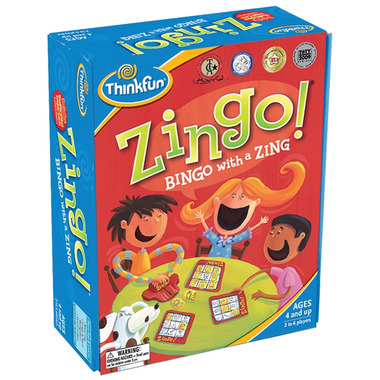 It’s not just bingo. It’s Zingo!, a matching game that encourages pre-readers and early readers alike to match the pictures and words to their challenge cards. The Zingo! Zinger dispenses tiles and fun as young minds quickly race to be the first player with a full card and yell “ZINGO!” With two levels of play, this matching game builds language skills through fast-paced play.