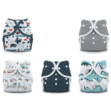 At Thirsties, they're passionate about the Great Outdoors. Camping, hiking, simply basking in the breathtaking beauty - it's one of the things that make life great. This new Outdoor Adventure Collection Package comes with 5 Duo Wrap Covers: 3 new nature-inspired prints and 2 new solids. Thirsties Duo Wraps are completely waterproof yet remain breathable, pliable, and very comfortable for your baby's delicate skin.  With the adjustable rise you will only need two sizes from birth to potty. Leg gussets provide advanced leak-proof protection and bindings are super-soft against your baby's skin. Whether your baby is tall or short, thin or chunky, this cover will keep those messes contained! Thirsties Duo Wraps are the preferred wrap for prefolds or trim fit diapers, such as our Stay Dry Duo Insert diaper. The inside of Duo Wraps can be wiped clean between uses allowing for fewer wraps in rotation and greater affordability. Thirsties recommends one cover for every 3-4 diapers in. They are very proud of the fact that all Thirsties products are manufactured in Colorado, USA, by a group of very talented individuals, many of whom are moms who work in the comfort and convenience of their own homes.