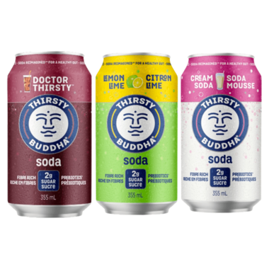 Thirsty Buddha Low-Sugar Prebiotic Soda Doctor ThirstyCarbonated water, chicory root inulin, sugars, (organic cane sugar) monk fruit juice concentrate, natural flavour, conentrated lemo juice, sea salt, tartaric acid, stevia leaf extract.