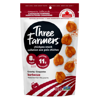 Three Farmers Roasted Chick Peas have 10g of protein per serving. They are grown and made in Canada with nothing artificial.
