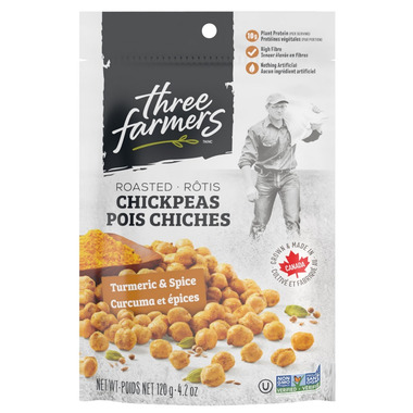 Three Farmers Roasted Chickpeas Turmeric & Spice has 10g of plant protein per serving and is grown and made in Canada.