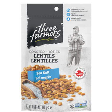 Three Farmers Roasted Lentils Sea Salt & Vinegar have 12g of plant protein per serving. They are a source of energy, high in fibre with nothing artificial, and grown & made in Canada.