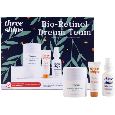 Purify Cleanser: Aqua/Water/Eau, Aloe Barbadensis (Aloe Vera) Leaf Juice, Disodium Cocoyl Glutamate, Glycerin, Pentylene Glycol, Populus Tremuloides (Aspen) Bark Extract, Betaine, Saccharomyces (Yeast) Ferment Filtrate, Cellulose Gum, Hydrolyzed Jojoba Esters, Xanthan Gum, Inulin, Cellulose, Glucose, Fructose, Camellia Sinensis (Green Tea) Extract, Cucumis Sativus (Cucumber) Extract, Sodium PCA, Sodium Lactate, Arginine, Aspartic Acid, PCA, Glycine, Alanine, Serine, Valine, Proline, Threonine, Isoleucine, Histidine, Phenylalanine, Citrus Aurantium Bergamia (Bergamot) Peel Oil, Sodium Phytate, Citric Acid Skin Hero Bio-Retinol Serum: Aqua/Water/Eau, Glycerin, Behenyl Alcohol, Bakuchiol, Dicaprylyl Ether, Glyceryl Caprylate, Rosa Canina (Rosehip) Seed Oil, Stearic Acid, Cetearyl Alcohol, Calendula Officinalis Flower Extract, Tocopherol, Pentylene Glycol, Caprylhydroxamic Acid, Glyceryl Stearate, Sodium Phytate, Xanthan Gum, Polyglyceryl-3 Dicitrate/Stearate, Sodium Hydroxide, Citrus Aurantium Amara (Bitter Orange) Peel Oil Dream Night Cream: Aqua/Water/Eau, Glycerin, Shorea Stenoptera Seed Butter, Squalane, Olus Oil, Cetearyl Alcohol, Cetyl Lactate, Propanediol, Glyceryl Stearate, Dicaprylyl Ether, Palmitic Acid, C12-16 Alcohols, Hydrogenated Lecithin, Diheptyl Succinate, Capryloyl Glycerin/Sebacic Acid Copolymer, Sodium Citrate, Xanthan Gum, Caprylhydroxamic Acid, Glyceryl Caprylate, Hydroxyethyl Acrylate/Sodium Acryloyldimethyl Taurate Copolymer, Astrocaryum Murumuru Seed Butter, Bidens Pilosa Extract, Gossypium Herbaceum (Cotton) Seed Oil, Linum Usitatissimum (Linseed) Seed Oil, Coco-Caprylate/Caprate, Polyglyceryl-3 Dicitrate/Stearate, Simmondsia Chinensis (Jojoba) Seed Oil, Tocopherol, Helianthus Annuus (Sunflower) Seed Extract