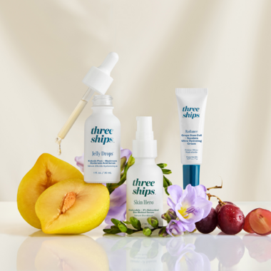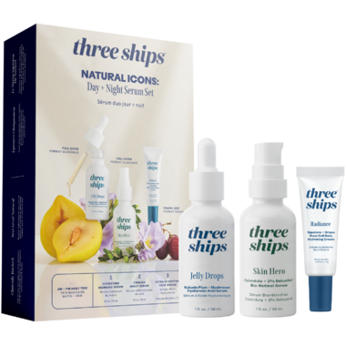 Start your morning with Three Ships award-winning Jelly Drops serum, packed with Tremella Mushroom and Kakadu Plum for long-lasting hydration and visibly even skin. At night, apply our best-selling Skin Hero Bio-Retinol Serum, a gentle yet powerful formula with 2% Bakuchiol and Calendula to smooth the look of fine lines and even skin tone. Finish with our Radiance Cream, made with Grape Stem Cells and sugarcane-derived Squalane for deep nourishment and all-day moisture.