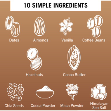 Dates, Hazelnuts, Almonds, Cacao Butter, Cacao Powder, Vanilla Extract, Chia Seeds, Coffee Beans, Maca Powder, Himalayan Pink Salt.