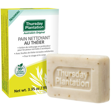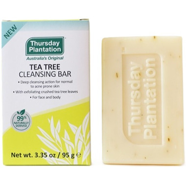 Thursday Plantation 99% naturally derived cleansing bar extracts even more goodness from the Australian tea tree plant by harnessing 100% pure Tea Tree Oil as well as crushed tea tree leaves to cleanse, purify and exfoliate face and body. For normal to acne-prone skin.