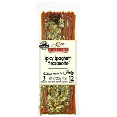 Tiberino Spicy Spaghetti Mezzanotte, artisan made in Italy. Makes 3 servings in 12 minutes.