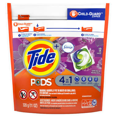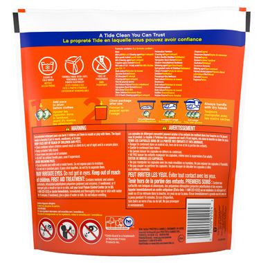 Caution: Concentrated detergent pacs can burst if children put them in mouth or play with them. The liquid inside is harmful if put in mouth, swallowed, or in eyes.KEEP PACS OUT OF REACH OF CHILDREN AND PETS. Store container where children cannot reach or climb to it, out of sight and in a secure place. Keep container fully closed. Never leave any pacs out of container. DO NOT let children handle pacs, even if supervised. AVOID BREAKING PACS. Do not handle pacs with wet or moist hands. Do not expose pacs to moisture. Do not cut or puncture pacs. If pacs stick together, do not try to separate them. MAY IRRITATE EYES. Do not get in eyes. Keep out of reachof children. FIRST AID TREATMENT: Contains nonionic and anionic surfactants, ethoxylated polyethylene polyamine (polymer) and enzymes. If swallowed, or if detergent gets in mouth or eye or on skin, call your local Poison Control Center (or in US: 1-800-222-1222) or doctor immediately. Immediately and thoroughly rinse eye or skin with water for 15 minutes. If swallowed, give a glass of water or milk. Do not induce vomiting.