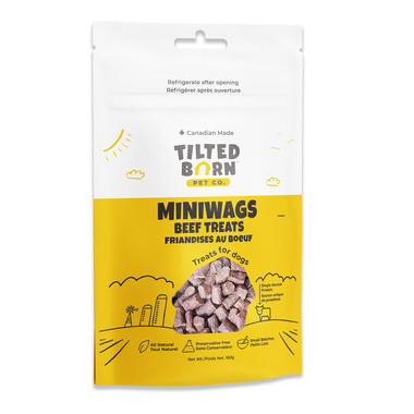 Tilted Barn Pet Co. are healthy, soft meaty treats for dogs and cats of all ages and sizes. They are preservative free and contain no fillers or by-products. These single source protein treats are made with all natural, high quality, whole ingredients from the human food market sourced from across the Canadian Prairies, and are 100% Canadian made. MiniWags are more convenient for small dogs, puppies, training, and for stuffing puzzle toys!