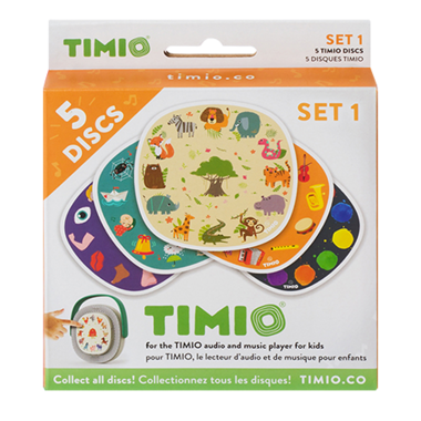 Extension set for the Timio player, featuring themes of wild animals, musical instruments, colours, nursery rhymes (volume 1), and body parts.